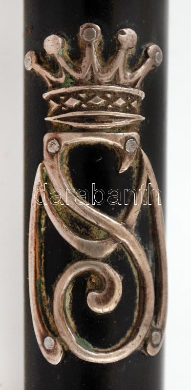 Antik, fából készült karmesteri pálca, rajta ezüst (Ag.) koronás "SM" vagy "MS" monogrammal, a nyél és a markolat találkozásánál törött illesztéssel, h: 32 cm