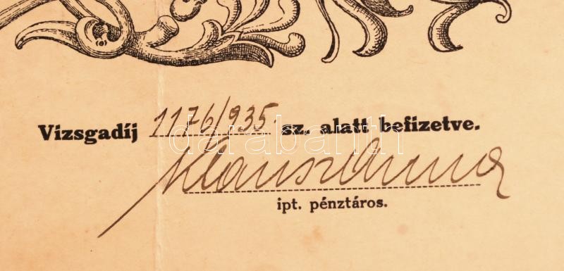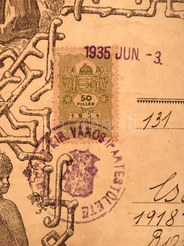 1935 Győr, díszes segédlevél mészáros- és hentessegéddé való kinevezésről, kitűnő minősítéssel, többek között ipartestületi elnöki aláírással, testületi bélyegzőkkel, 50 f okmánybélyeggel
