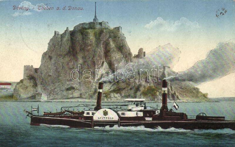 Leírás: Dévény, Theben a. d. Donau; SS Luitpold, Árpád szobor / steamship, statue