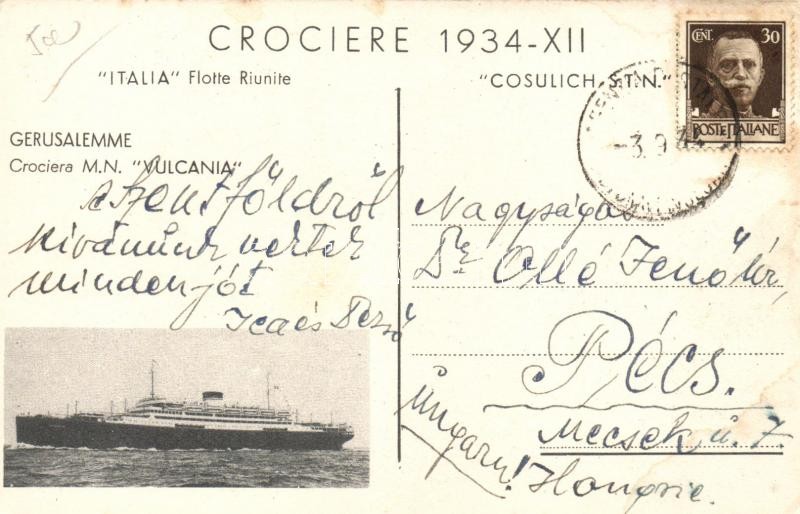 Jerusalem, 'Crociere 1934 XII', Italia Flotte Riunite, MN Vu... https://www.darabanth.com/hu/243-Gyorsarveres/243.0/Kepeslapok/Izrael~6000048/Jerusalem-Crociere-1934-XII-Italia-Flotte-Riunite-MN-Vulcania-on-the-backside-EK~II971009