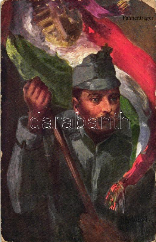 Leírás: Zászlóvivő / WWI Hungarian flag, military, soldier, B.K.W.I. Serie 301-5. s: B. Bélaváry (EK)