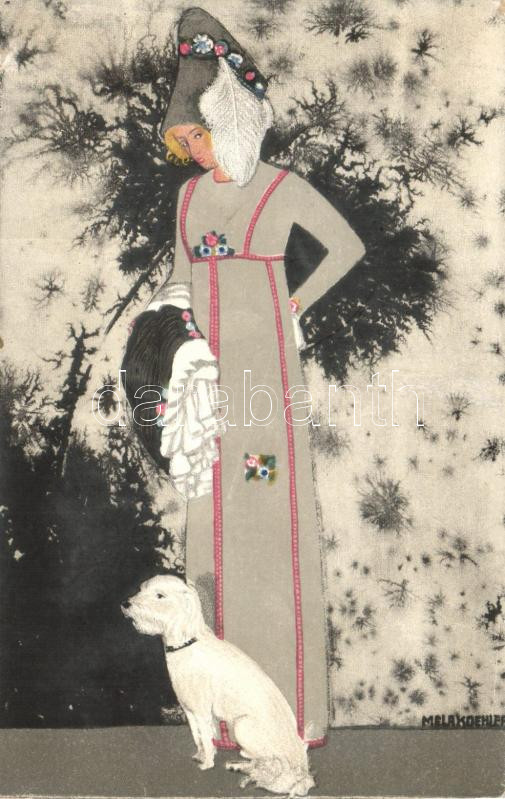 Leírás: Lady, dog, Wiener Werkstätte No. 522 s: Mela Koehler (gluemark)