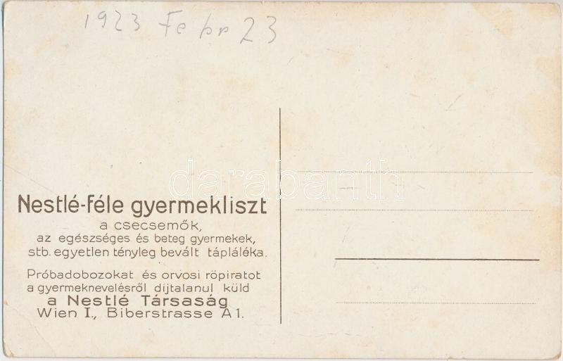 Nestlé-féle gyermekliszt; bakugrás / children's flour, advertisement on backside, children at gym class, leap frog, Serie II. litho (kis szakadás / small tear)