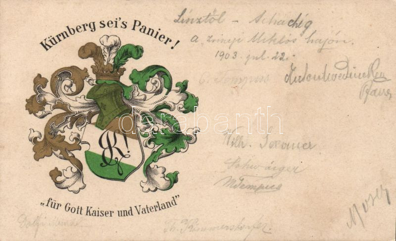 Kürnberg sei's Panier! "für Gott Kaiser und Vaterland" ... https://www.darabanth.com/hu/243-Gyorsarveres/243.0/Kepeslapok/Zaszlo-Cimer~6000028/Kurnberg-seis-Panier-fur-Gott-Kaiser-und-Vaterland-German-student-coat-of-arms~II344599