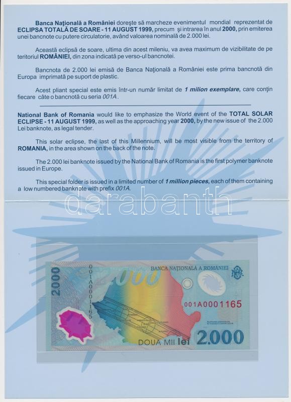 Romania 1999. 2000 Lei "Solar eclipse" in card with information, in folder (9x) C:UNC