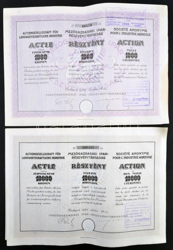 Leírás: Budapest 1922-1923. "Mezőgazdasági Ipar-Részvénytársaság" részvénye 1000K-ről és 10.000K-ról szelvényekkel, bélyegzésekkel T:II
