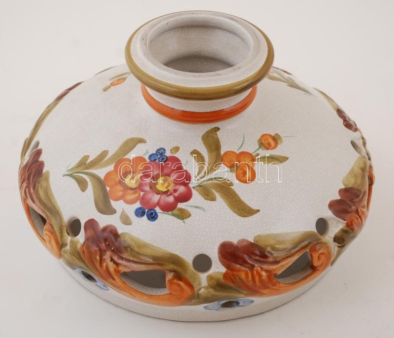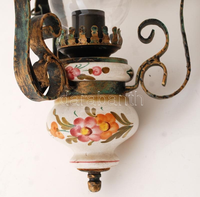 Nagyméretű kovácsoltvas csillár, virágmotívumos, máz alatt repesztett, kézzel festett, jelzés nélküli porcelán testtel, belül üveg búrával, m: cca 100 cm