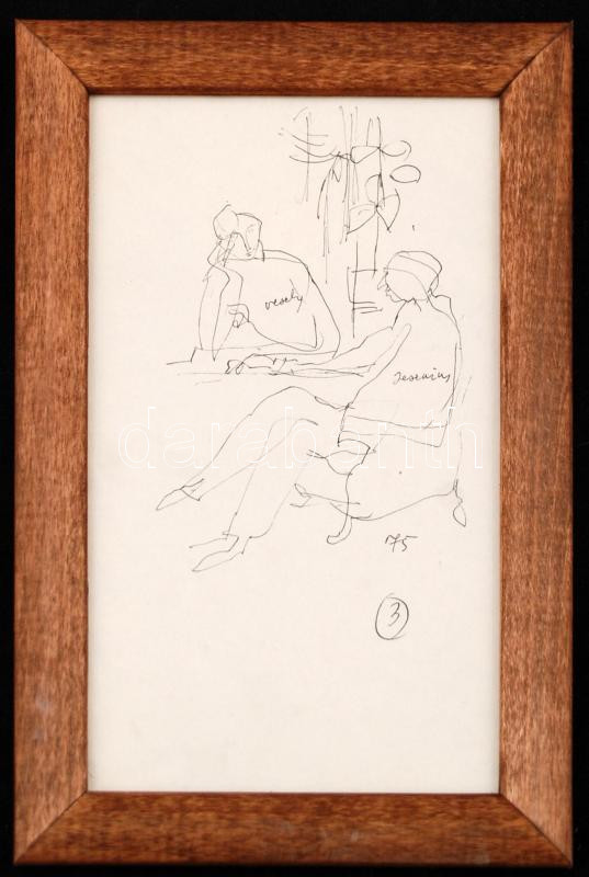 Leírás: Szász Endre (1926-2003): Vesely és Jesenius (skicc rajz). Tus, papír, jelzés nélkül, üvegezett keretben, 19×11 cm