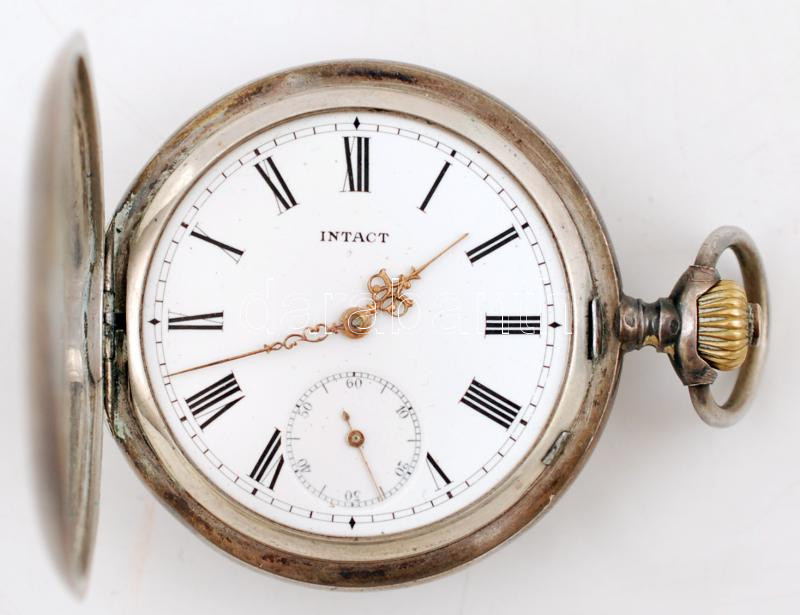 Leírás: Intact ezüst(Ag) zsebóra, másodpercmutatóval, üveglapja hiányzik, jelzett, br: 100,6 g