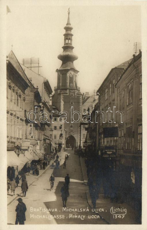 Leírás: Pozsony, Mihály utca, gyógyszertár, Jaklitsch és J. Winawer üzlete / street, pharmacy, shops