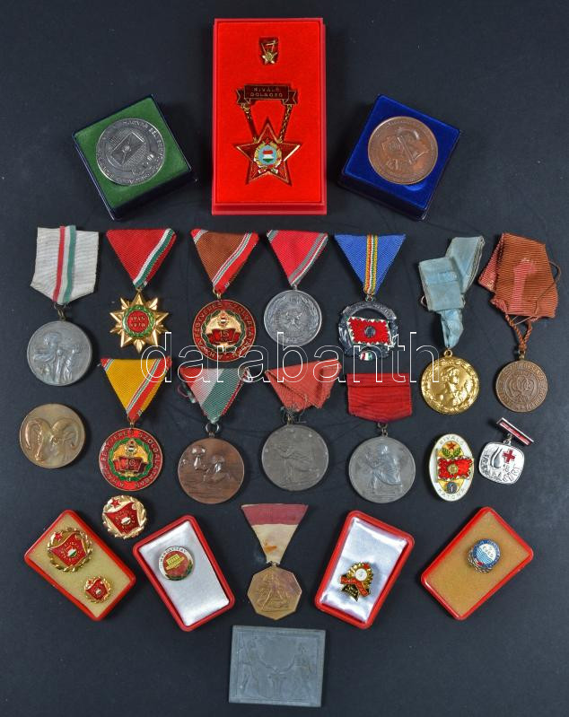 Leírás: Kis doboznyi vegyes szocialista kitüntetés, jelvény, emlékérem, sportérem, közte zománcozott és tokos darabok is T:vegyes