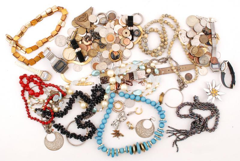 Leírás: Egy doboznyi vegyes bizsu tétel: különféle karkötők, nyakláncok, stb. + órák, érmék