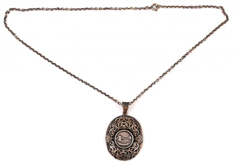 Leírás: Ezüstözött nyaklánc medállal, a medálon a Lánchíd látképével, h:42 cm, medál 4x3 cm