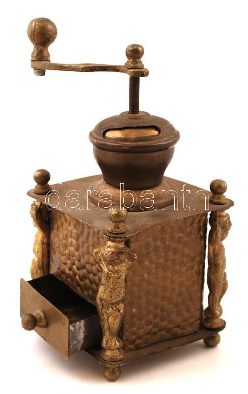 Leírás: Réz kávédaráló kis oszloptartó puttókkal, javított, 18x9x9 cm