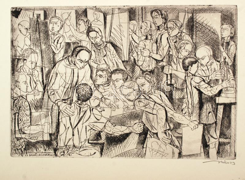 Leírás: Hincz Gyula (1904-1986): Képzőművészeti szabadiskola. Rézkarc, papír, jelzett, 19×29 cm