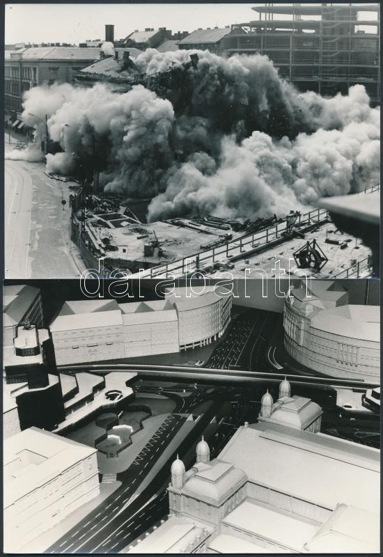 Leírás: 1980 Budapest, Marx tér(Nyugati tér), 4 db fotó az útban levő ház kirobbantásáról és a tér átépítésének makettje, 13x18 cm