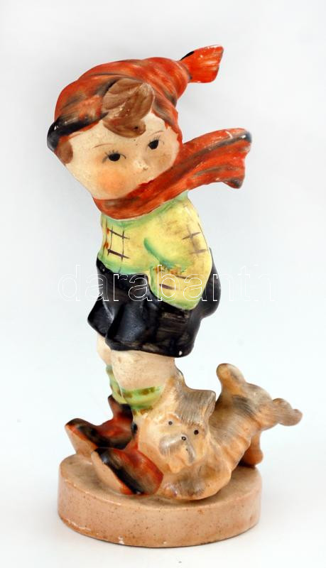 Leírás: Hummel copy, kisfiú kutyával, kézzel festett, jelzés nélkül, kis kopásnyomokkal, m: 12,5 cm