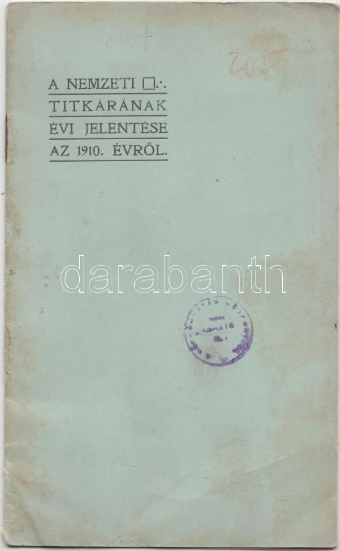 1910 A Nemzeti Páholy titkárának jelentése 12p. https://www.darabanth.com/hu/245-Gyorsarveres/245.0/Festmeny-mutargy-papirregiseg-egyeb/Nyomtatvanyok~600020/1910-A-Nemzeti-Paholy-titkaranak-jelentese-12p~II983754