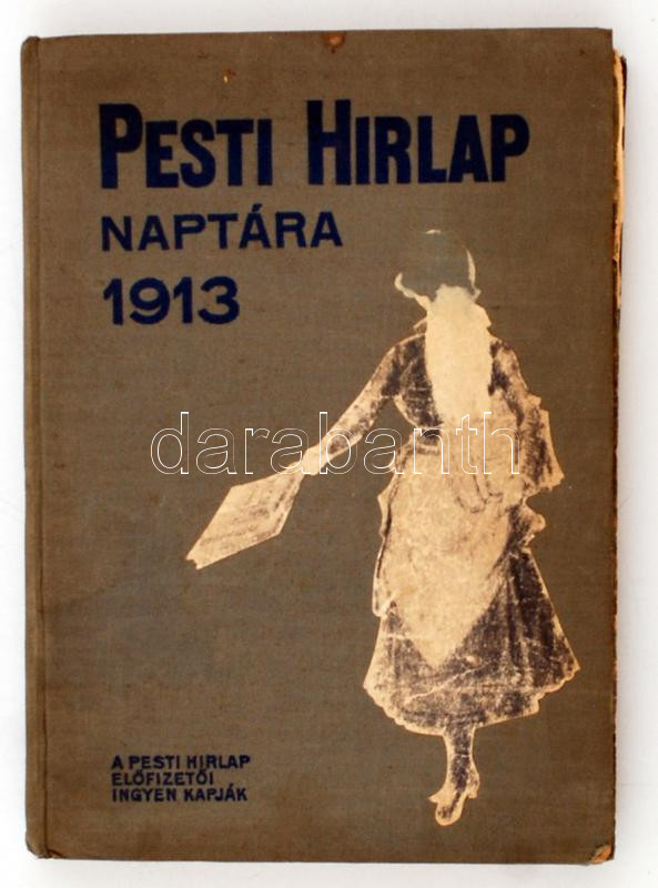 1913 A Pesti Hírlap naptára 1913. Bp., Légrády Testvérek. Illusztrált kiadói egészvászon kötésben. Az első pár oldal elvált. Sok képpel, érdekes információkkal teli kiadvány.