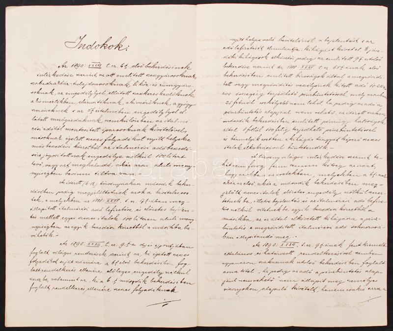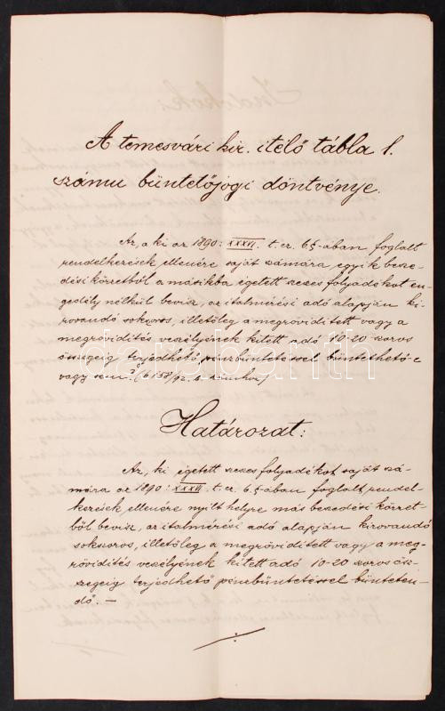 Leírás: 1893 A temesvári kir. ítélő tábla 1. számu büntetőjogi döntvénye, 34x21cm