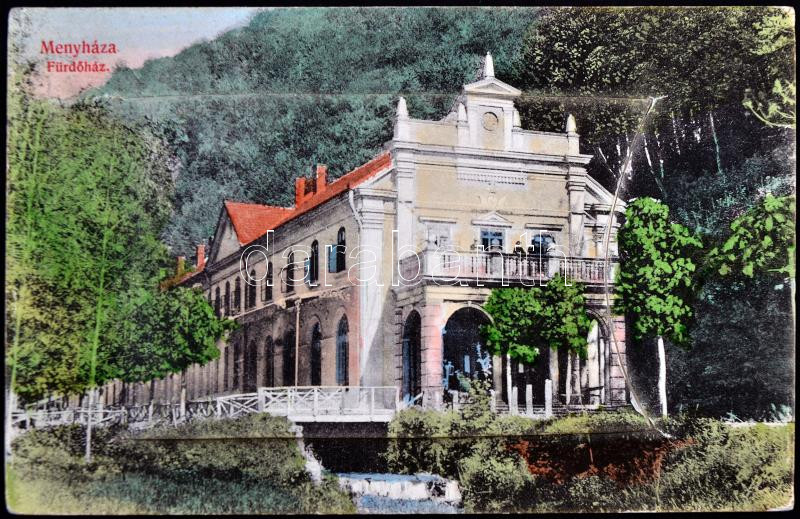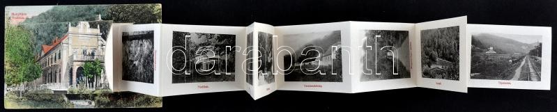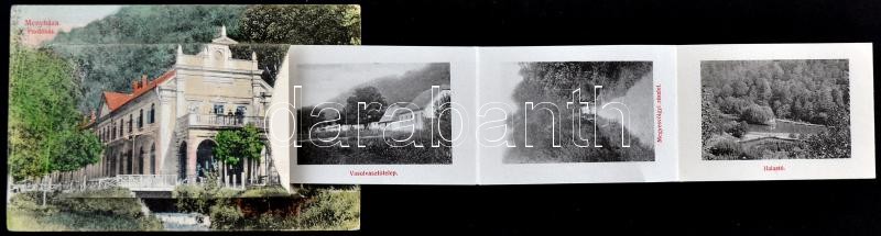 Menyháza, Moneasa; Fürdőház leporellós képeslap (belül vasútállomás és vasolvasztó telep); Fái Károly kiadása / spa building, leporellocard (railway station and iron works inside)