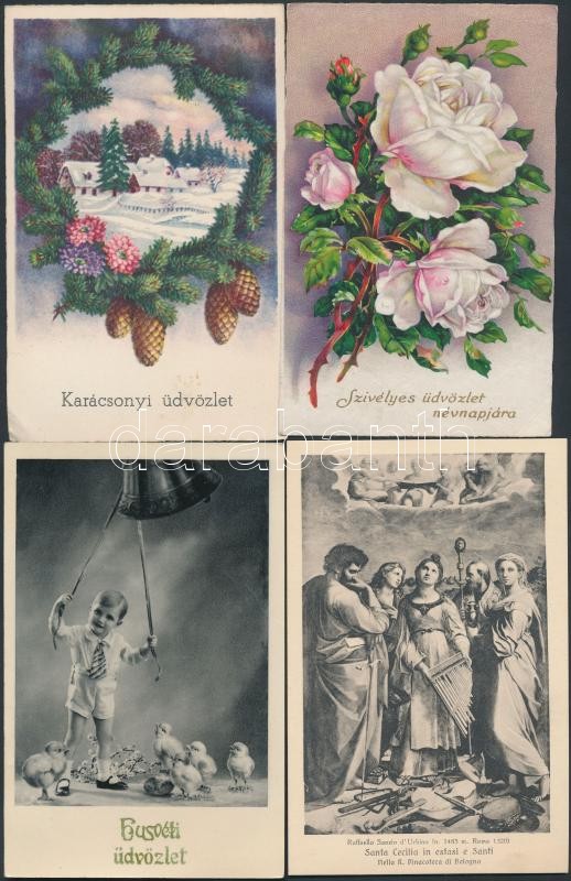 166 db főleg RÉGI motívumlap pár városképes lappal, lithokkal és sérült lapokkal; üdvözlő, karácsony, húsvét / 166 mostly old motive cards with some town-view cards, litho and damaged cards; greetings, Christmas, Easter
