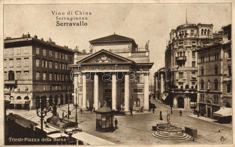 Leírás: Trieste, Piazza della Borsa, Vino di China ferruginoso Serravallo / square, advertisement, Raphael Tuck & Sons, 'Gravürotinto' Series 'Trieste' exchange office