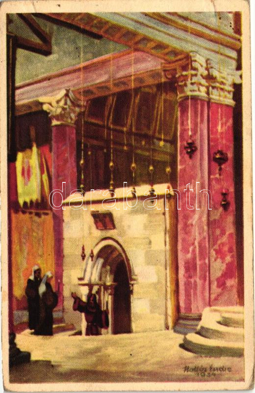 Leírás: Betlehem, Születési barlang bejárata; Klösz Coloroffset / Place where Jesus was born; art postcard s: Hollós Endre (fl)