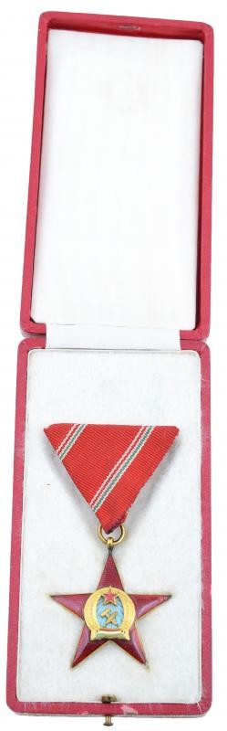 Hungary 1949. "Medal of Merit of the Hungarian Peoples Republic Gold class" enamelled gilt Br decoration on ribbon, in case C:XF