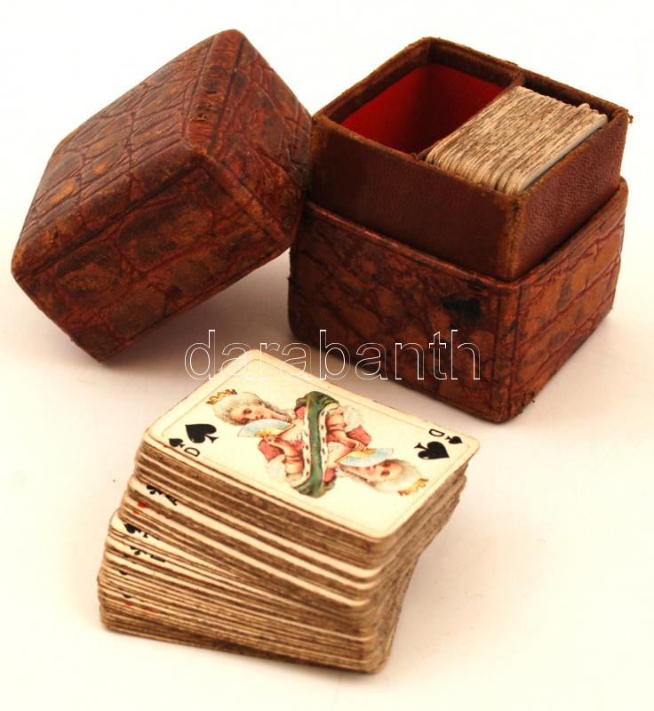 Leírás: Antik mini pasziánsz kártya pakli, saját bőr dobozában, 5×4 cm