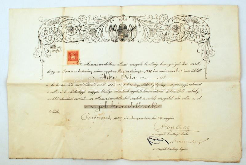 Leírás: 1909 Krassó-Szőrény vármegye, Resiczabánya, államszámviteltani bizonyítvány, okmánybélyeggel (2kr),kissé viseltes állapotban, 34x50cm