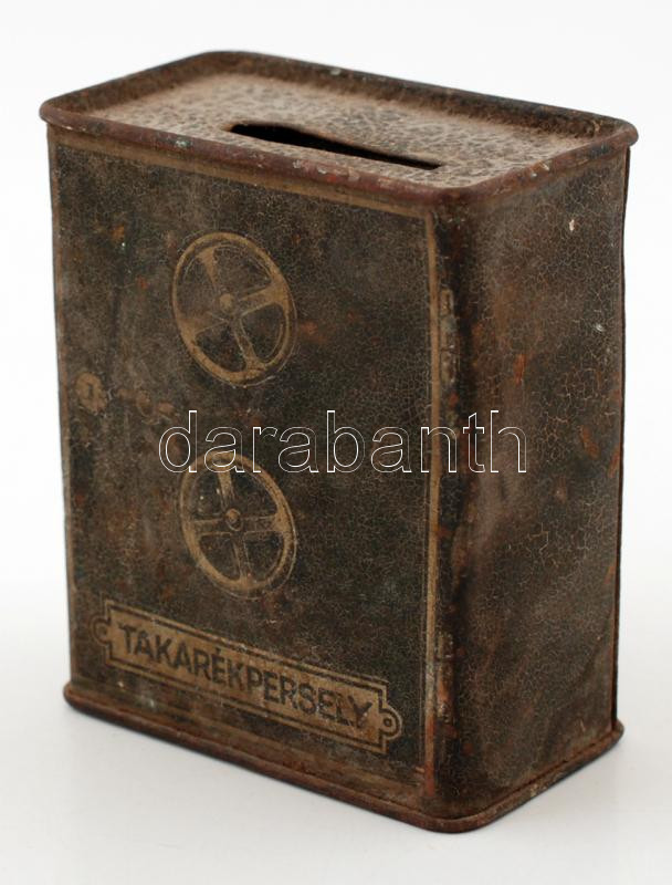 Leírás: Régi, fém Takarékpersely, kulcs nélkül, kopottas állapotban, 10x8x5cm