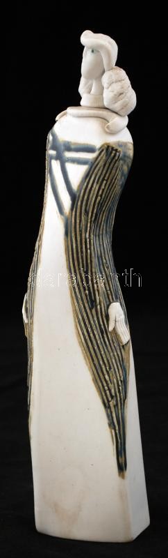Leírás: Sarkantyu Judit (1947-):Női figura. Festett mázas kerámia, jelzett, apró lepattanással, m:28 cm