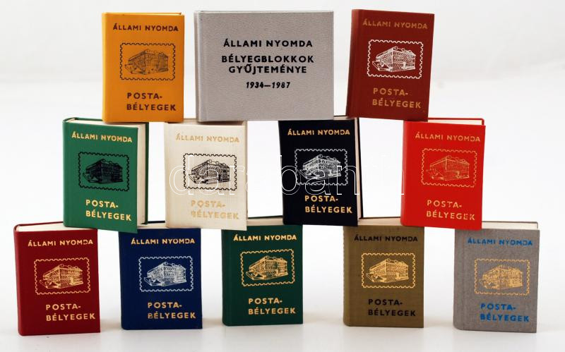 Magyar postabélyegek. 1-11. köt. Bp., 1982-1988, Állami Nyomda - Magyar Posta. Minikönyvek, 308. ill. 310. számú sorszámozott példányok. Vászonkötésben, jó állapotban.; Állami Nyomda bélyegblokkok gyűjteménye. 12. köt.: 1934-1987. Bp., 1988, Állami Nyomda. Minikönyv, 310. számú sorszámozott példány. Vászonkötésben, jó állapotban.