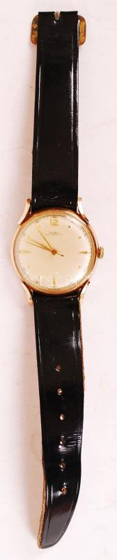 Leírás: cca 1950 Doxa Anti magnetic mechanikus, arany karóra 14 K, bőr szíjjal. Müködő állapotban, kijáró felhúzókoronával / Doxa 15 C golden watch