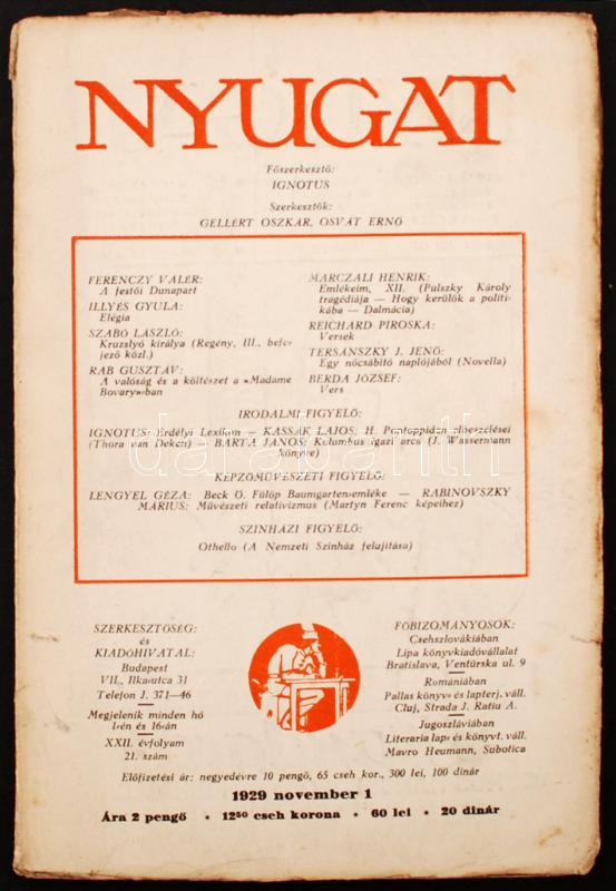 Leírás: 1929 A Nyugat című folyóirat XXII. évfolyamának 21. száma, benne Illyés Gyula, Ignotus, Marczali Henrik és mások írásaival