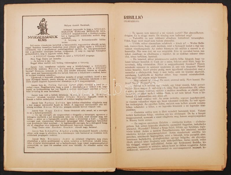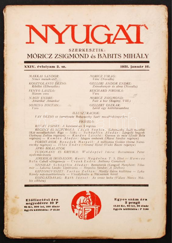 Leírás: 1931 A Nyugat című folyóirat XXIV. évfolyamának 2. száma, benne Makkai Sándor, Somlyó Zoltán, Gelléri Andor Endre és mások írásaival