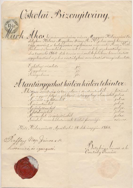 Leírás: 1864 Kolozsvárott, Iskolai bizonyítvány szép viaszpecséttel és 15 kr okmánybélyeggel