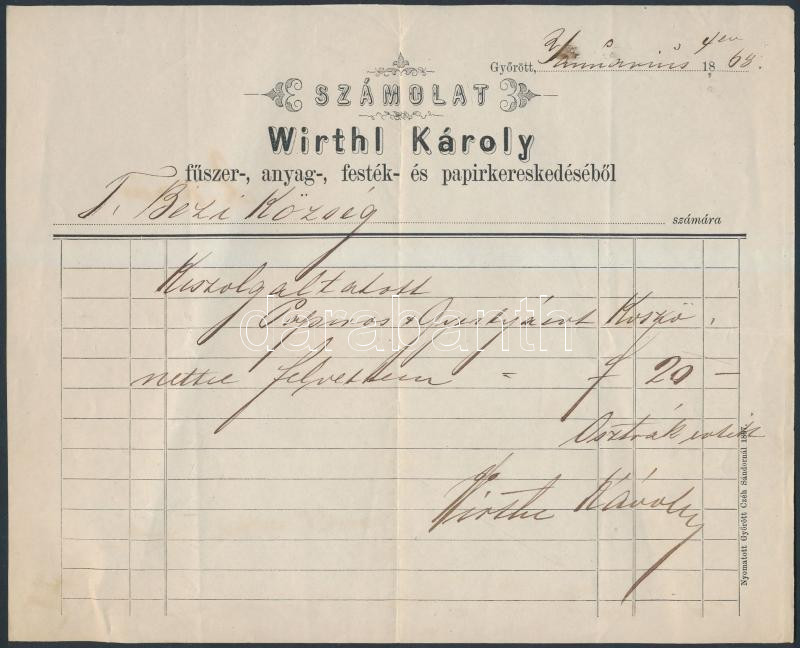 Leírás: 1868 Győr, Wirthl Károly fűszer-, anyag-, festék- és papírkereskedése által kiállított számolat