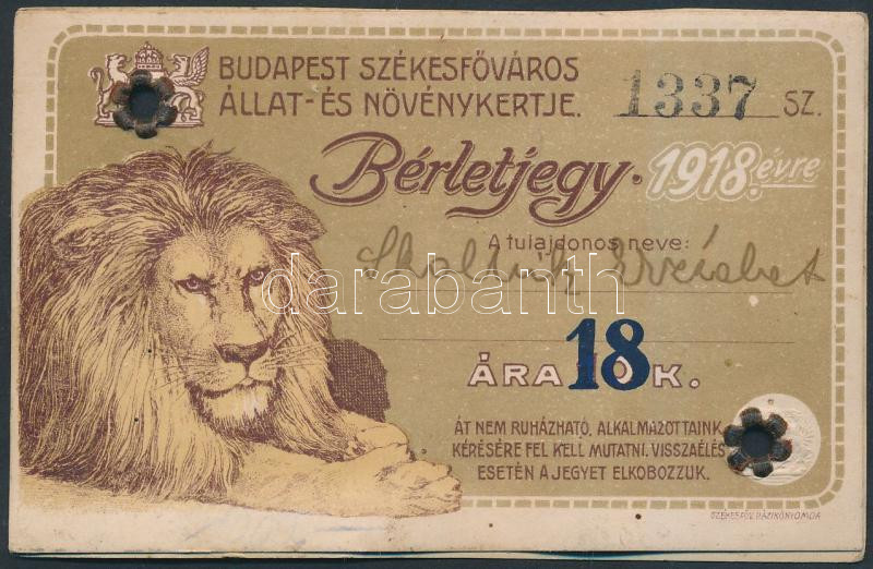 1918 Budapest Székesfőváros Állat- és Növénykertje által kiállított bé... https://www.darabanth.com/hu/247-Gyorsarveres/247.0/Festmeny-mutargy-papirregiseg-egyeb/Okmanyok~1000015/1918-Budapest-Szekesfovaros-Allat-es-Novenykertje-altal-kiallitott-berletjegy~II1179331
