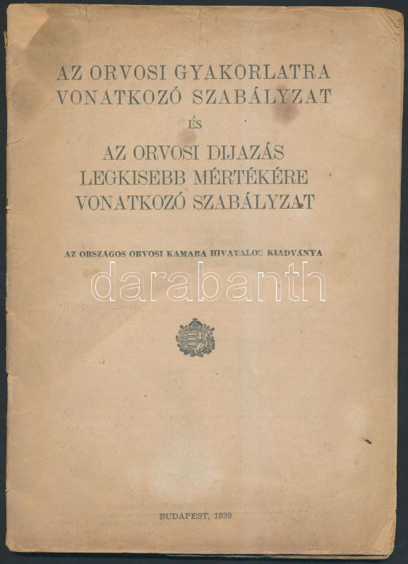 1939 Az orvosi gyakorlatra vonatkozó szabályzat és az orvosi díjazás legkisebb mértékére vonatkozó szabályzat. Bp., Országos Orvosi Kamara. Kopott papírkötésben, egyébként jó állapotban.