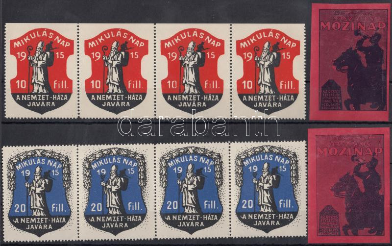 Leírás: 1915 Mikulásnap 2 x 4 db levélzáró összefüggésben + Mozinap 2 db levélzáró