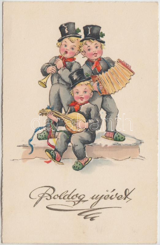 New Year, Children music band, accordion, trumpet, Pittius litho https://www.darabanth.com/hu/247-Gyorsarveres/247.0/Kepeslapok/Udvozlolap~26/New-Year-Children-music-band-accordion-trumpet-Pittius-litho~II1073596