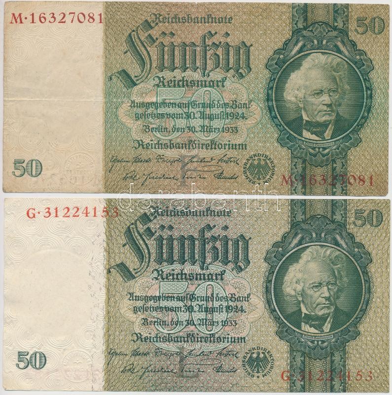 Germany / Weimar Republic 1929. 10 Mark (2x) + German Third Reich 1933. 50 Mark (2x) C:XF,F