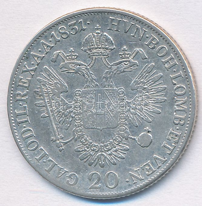 Au... https://www.darabanth.com/hu/247-Gyorsarveres/247.0/Numizmatika/Kulfoldi-fem-es-ezustpenzek~600011/Ausztria-olasz-verdejel-1831M-20Kr-Ag-I-Ferenc-T2---Austria-Italian-mint-mark-1831M-20Kr-Ag-~II1069527