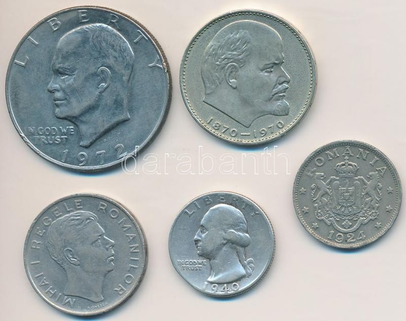 Vegyes: Amerikai Egyesült Államok 1940. 1/4$ Ag "Washington Quarter" + 1972D 1$ Cu-Ni "Eisenhower" + Románia 1924. 2L Cu-Ni + 1943. 100L Ni borítású acél + Szovjetunió 1970. 1R Cu-Ni-Zn T:1-,2,2-