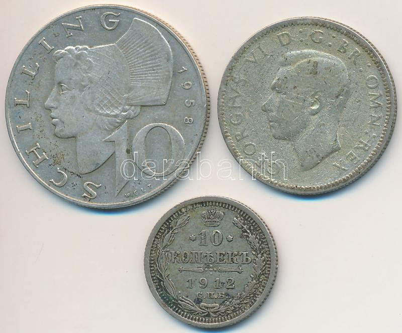 Vegyes: Ausztria 1958. 10Sch Ag + Nagy-Britannia 1941. 1Sh Ag "VI. György" + Orosz Birodalom 1912. 10k Ag T:2-,3