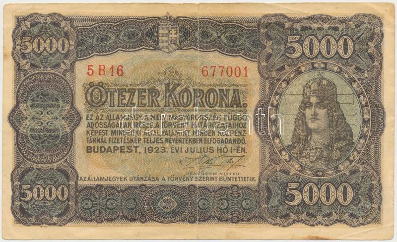 1923. 5000K nyomdahely nélkül, "T.W." jelöléssel T:III https://www.darabanth.com/hu/247-Gyorsarveres/247.0/Numizmatika/Magyar-bankjegyek~600006/1923-5000K-nyomdahely-nelkul-TW-jelolessel-TIII~II1176905