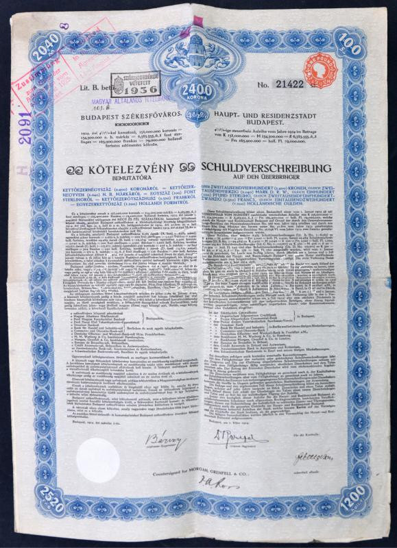 Budapest 1914. "Budapest Székesfőváros - Kötelezvény" 2400K-...