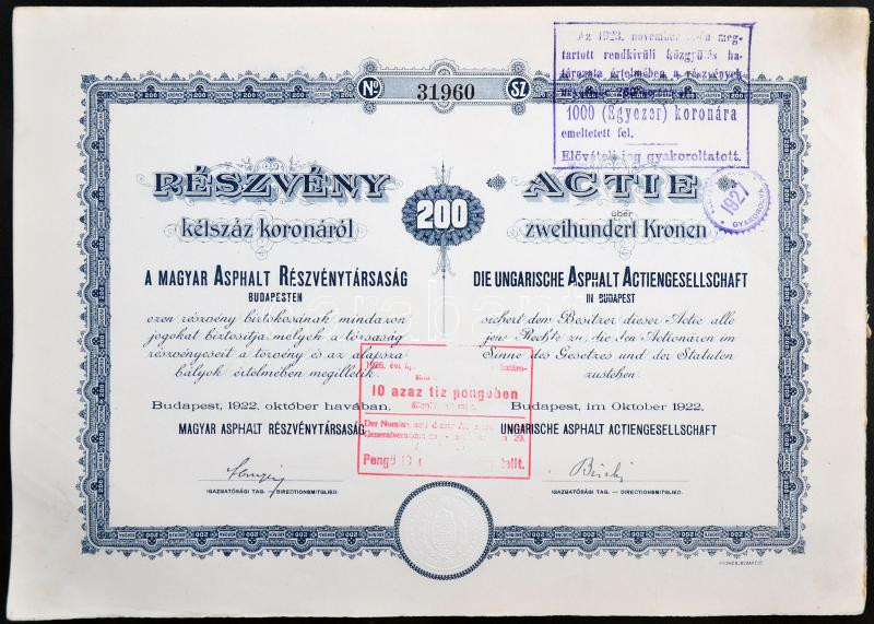 Leírás: Budapest 1922. "A Magyar Asphalt Részvénytársaság" részvénye 200K-ról (2x) sorszámkövetők, mindkettő szárazpecséttel, felülbélyegzettek T:I-